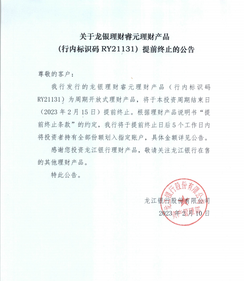 龙江银行龙银理财睿元理财产品(行内标识码RY21131)发行公告 |