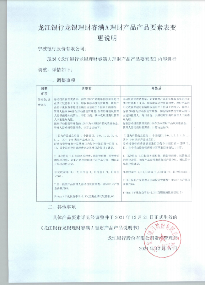 龙江银行龙银理财睿满A理财产品产品要素表变更说明