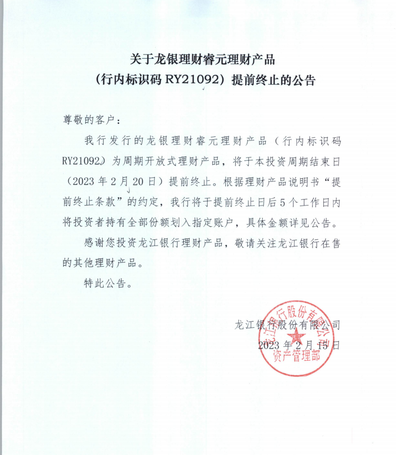 龙银理财睿元理财产品(行内标识码RY21092)第一周期运作公告 龙银理财睿元理财产品(行内标识码RY21092)第二个周期相关要素公告 龙江银行龙银理财睿元理财产品(行内标识码RY21092)分红公告 |