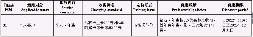 依据《商业银行服务价格管理办法》,龙江银行新增信用卡钻石卡卡种,收费标准官网进行公示,公示时间自2022年8月1日至2022年10月31日止,利息及收费标准等相关内容如下表:
