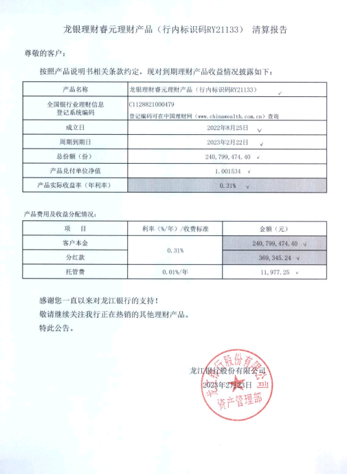 龙银理财睿元理财产品(行内标识码RY21133)清算报告