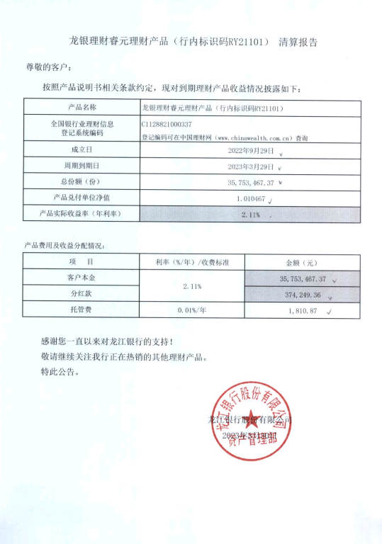 龙银理财睿元理财产品(行内标识码RY21101)清算报告