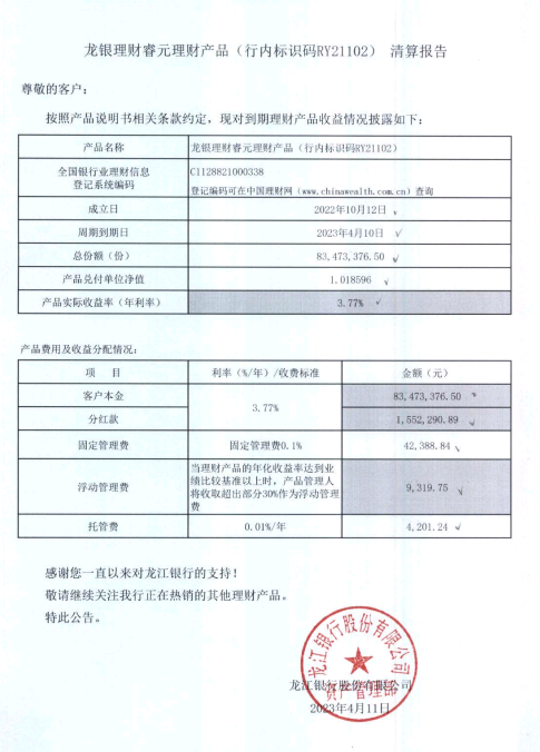 龙银理财睿元理财产品(行内标识码RY21102)清算报告