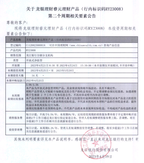 关于龙银理财睿元理财产品(行内标识码RY23008)第二个周期相关要素公告