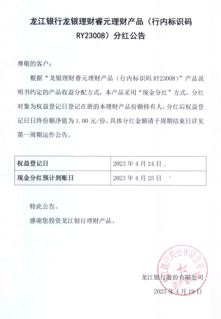 龙江银行龙银理财睿元理财产品(行内标识码RY23008)分红公告