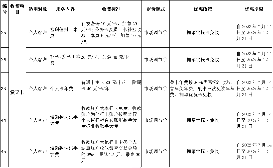 为响应中国银保监会黑龙江监管局关于落实《黑龙江省军人军属、退役军人和其他优抚对象基本优待目录清单(试行)》的通知号召,龙江银行修改《龙江银行服务收费价格目录》中信用卡工本费、年费、跨行转账手续费相关条目的优惠内容,优惠标准官网进行公示,优惠收费标准等相关内容如下表: