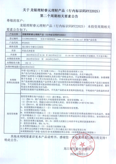 关于龙银理财睿元理财产品(行内标识码RY22025)第二个周期相关要素公告