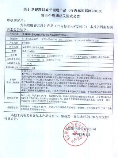 关于龙银理财睿元理财产品(行内标识码RY23010)第五个周期相关要素公告