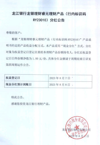 龙江银行龙银理财睿元理财产品(行内标识码RY23010)分红公告