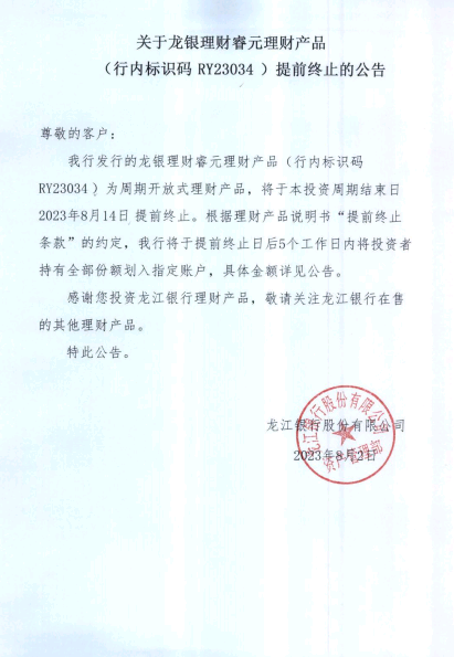 龙银理财睿元理财产品(行内标识码RY23034)提前终止的公告