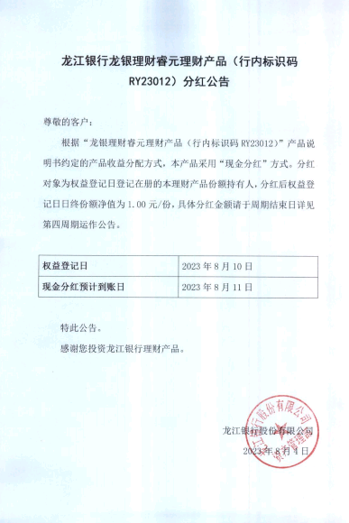 龙江银行龙银理财睿元理财产品(行内标识码RY23012)分红公告