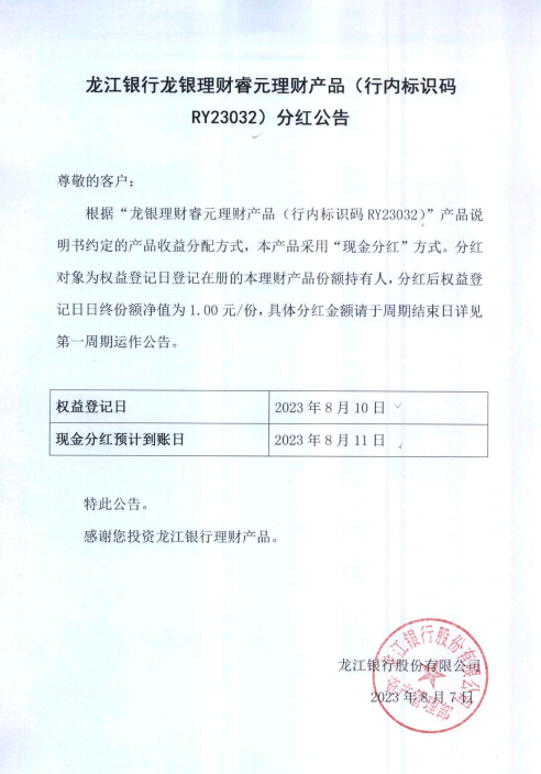 龙江银行龙银理财睿元理财产品(行内标识码RY23032)分红公告