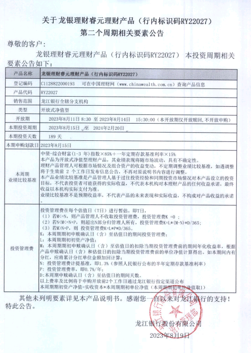 关于龙银理财睿元理财产品(行内标识码RY22027)第二个周期相关要素公告