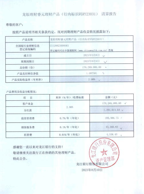 龙银理财睿元理财产品(行内标识码RY23031)清算报告