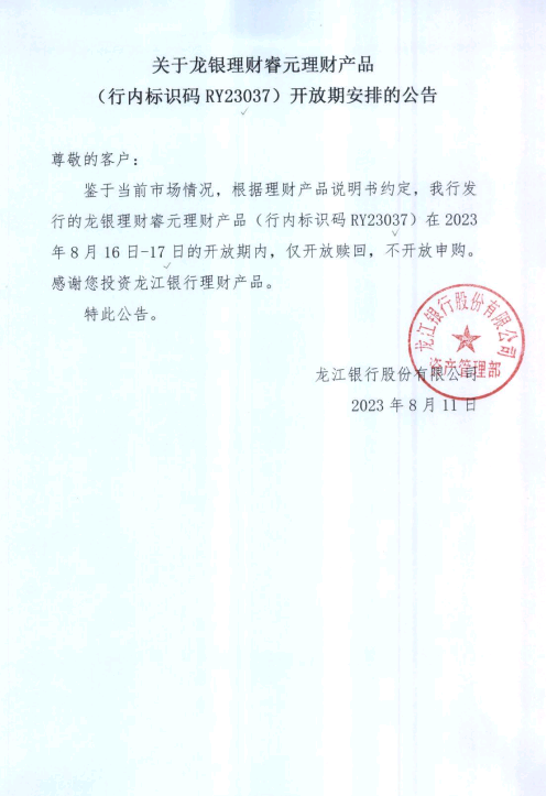 关于龙银理财睿元理财产品(行内标识码RY23037)开放期安排的公告