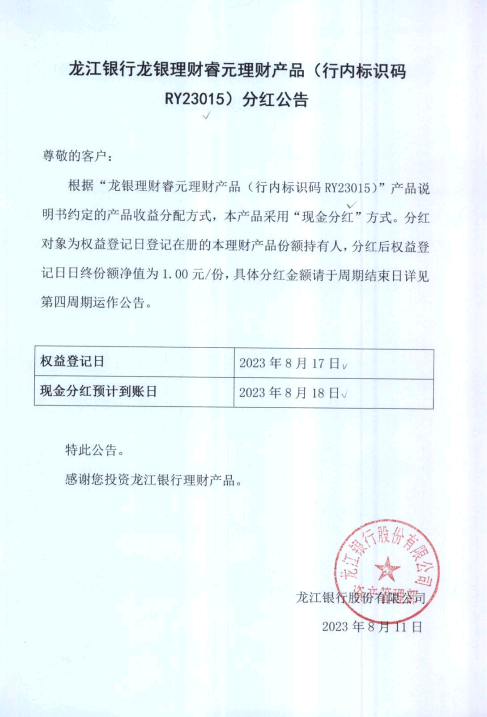 龙江银行龙银理财睿元理财产品(行内标识码RY23015)分红公告