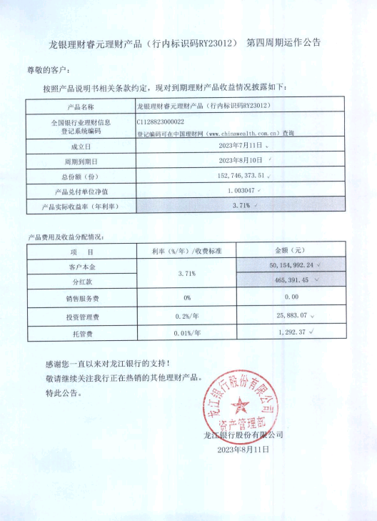龙银理财睿元理财产品(行内标识码RY23012)第四周期运作公告