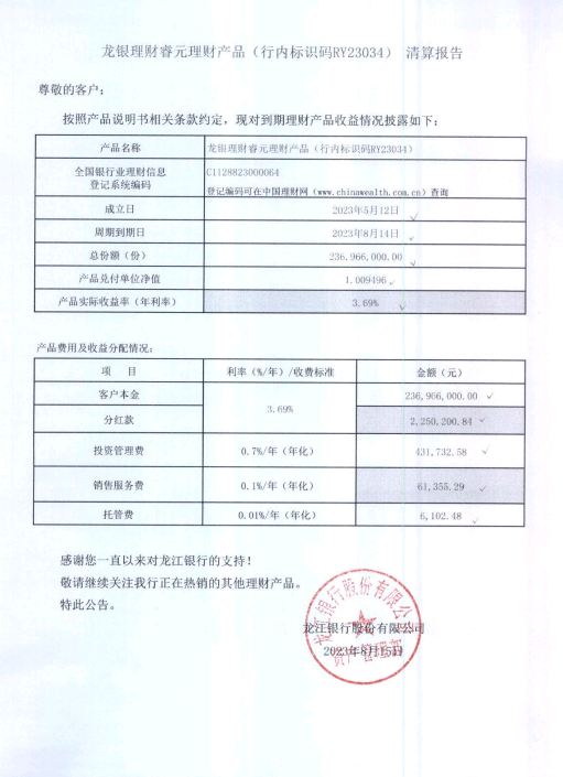 龙银理财睿元理财产品(行内标识码RY23034)清算报告