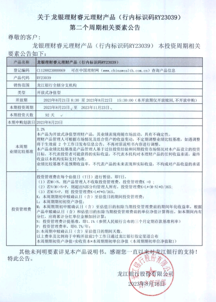 龙银理财睿元理财产品(行内标识码RY23039)第二个周期要素公告