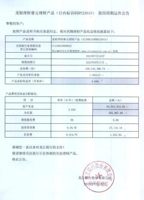 龙银理财睿元理财产品(行内标识码RY23015)第四周期运作公告