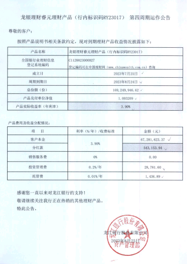 龙银理财睿元理财产品(行内标识码RY23017)第四周期运作公告