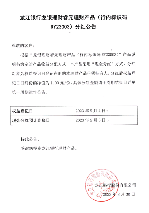 关于龙银理财睿元理财产品(行内标识码RY23003)分红公告