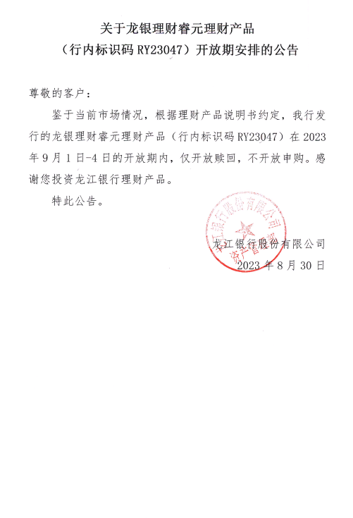 关于龙银理财睿元理财产品(行内标识码RY23047)开放期安排的公告