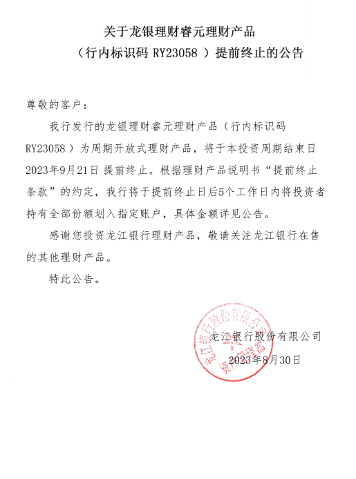 关于龙银理财睿元理财产品(行内标识码RY23058)提前终止的公告