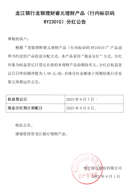 龙银理财睿元理财产品(行内标识码RY23010)分红公告