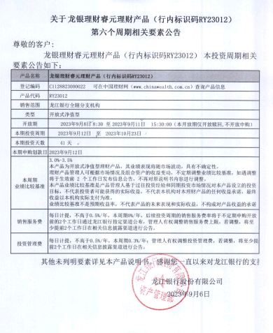 龙银理财睿元理财产品(行内标识码RY23012)第六个周期相关要素公告