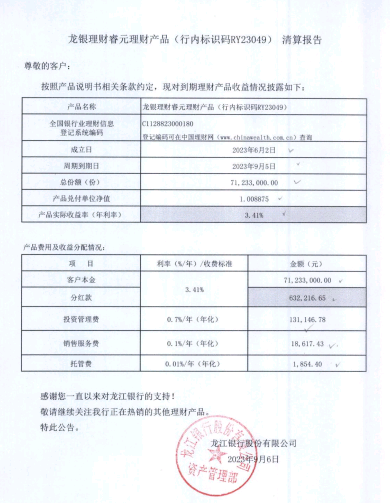 龙银理财睿元理财产品(行内标识码RY23049)清算报告