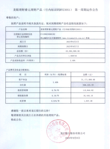 龙银理财睿元理财产品(行内标识码RY23051)第一周期运作公告
