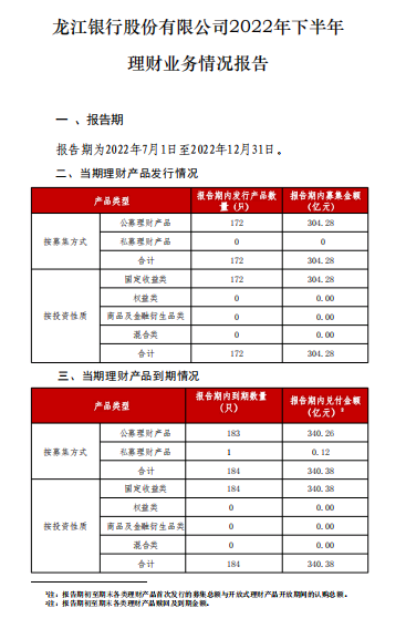 龙江银行股份有限公司2022年下半年理财业务情况报告
