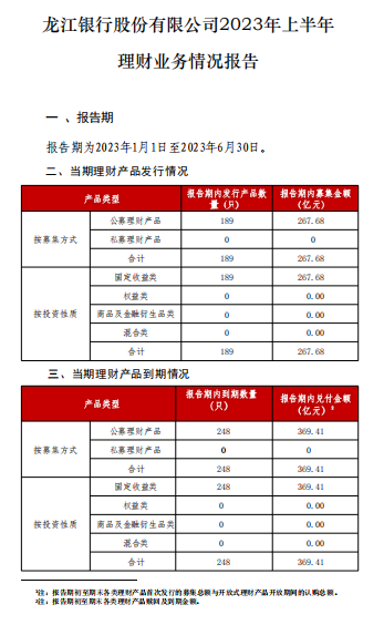 龙江银行股份有限公司2023年上半年理财业务情况报告