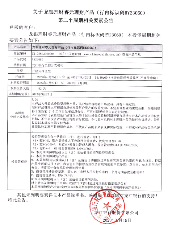 关于龙银理财睿元理财产品(行内标识码RY23060)第二个周期相关要素公告