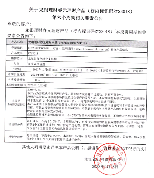 龙银理财睿元理财产品(行内标识码RY23018)第六个周期相关要素公告