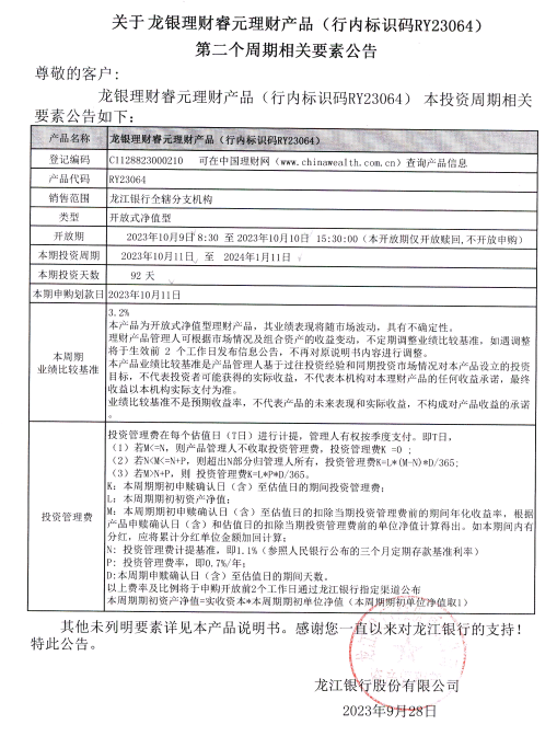 龙银理财睿元理财产品(行内标识码RY23064)第二个周期相关要素公告