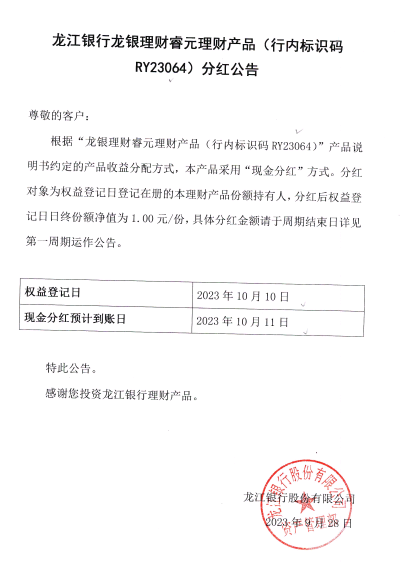 龙银理财睿元理财产品(行内标识码RY23064)分红公告