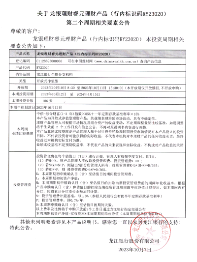 龙银理财睿元理财产品(行内标识码RY23020)第二个周期相关要素公告