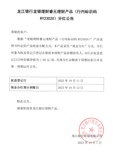 龙银理财睿元理财产品(行内标识码RY23020)分红公告