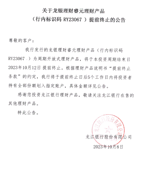 龙银理财睿元理财产品(行内标识码RY23067)提前终止的公告