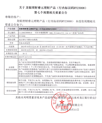 龙银理财睿元理财产品(行内标识码RY23008)第七个周期相关要素公告