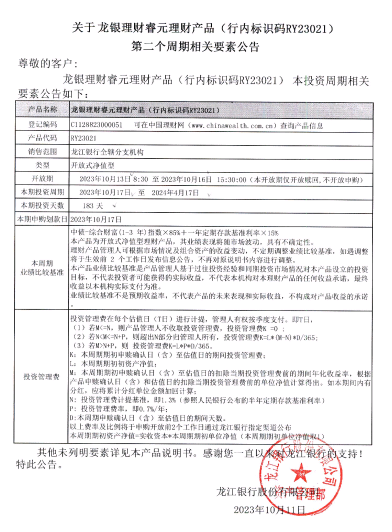龙银理财睿元理财产品(行内标识码RY23021)第二个周期相关要素公告