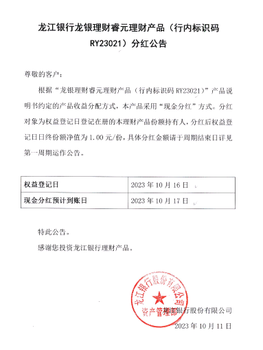 龙银理财睿元理财产品(行内标识码RY23021)分红公告
