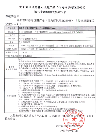 龙银理财睿元理财产品(行内标识码RY23068)第二个周期相关要素公告