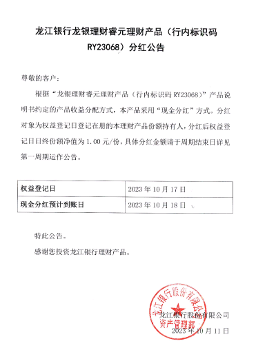 龙银理财睿元理财产品(行内标识码RY23068)分红公告