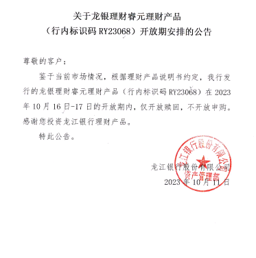 龙银理财睿元理财产品(行内标识码RY23068)开放期安排的公告