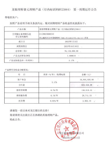 龙银理财睿元理财产品(行内标识码RY23064)第一周期运作公告