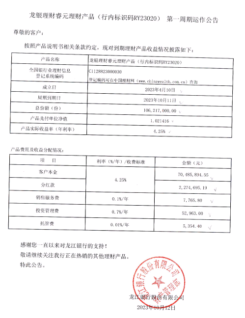 龙银理财睿元理财产品(行内标识码RY23020)第一周期运作公告