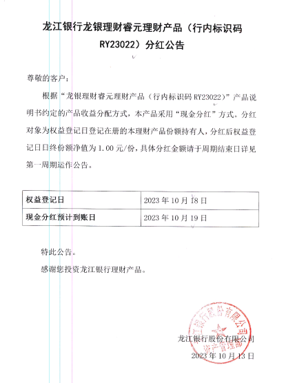 关于龙银理财睿元理财产品(行内标识码RY23022)分红公告